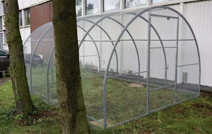 Vďaka robustnej a bezúdržbovej hliníkovej konštrukcii je táto voľne stojaca voliéra s dverami, opatrenými vysoko odolnými pántami, určená na to, aby toho veľa vydržala. Je tak pevná, že môže dokonca udržať osobu visiacu zo strechy.