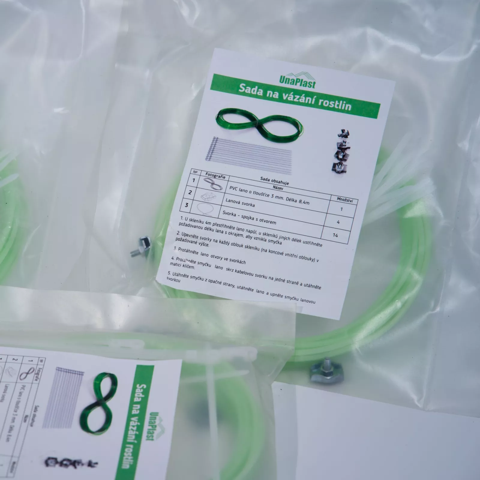 Balenie obsahuje dve lanká dlhé podľa vybranej dĺžky skleníka a očká, ktorými lanko prevlečiete. Napríklad pre štvormetrový skleník teda obdržíte dva kusy lanka, každé lanko s dĺžkou štyri metre.