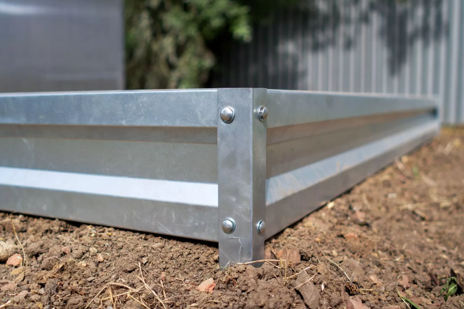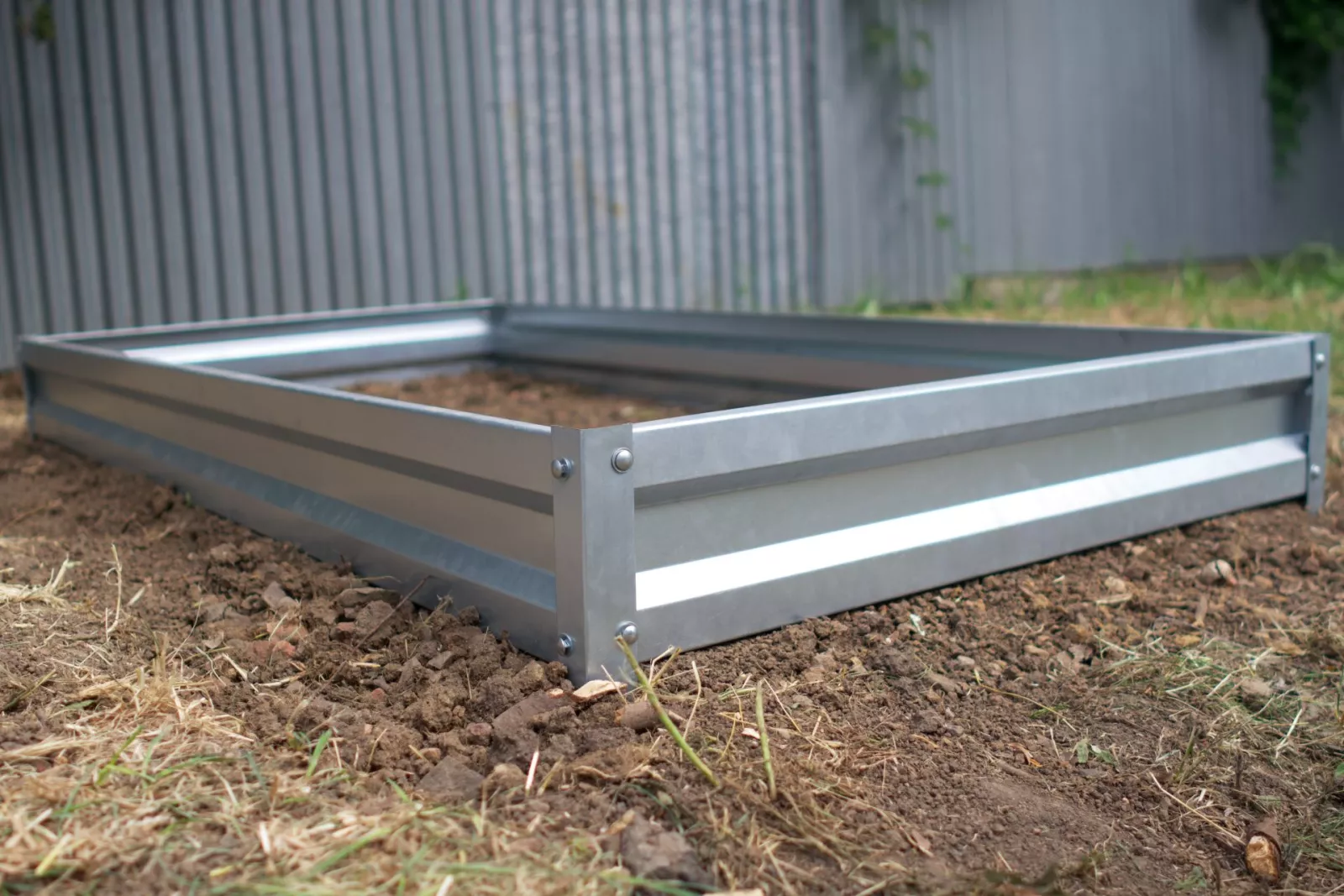 Vyvýšený záhon do skleníkov vyrobený z pozinkovaného kovu uľahčuje prístup k pestovaným rastlinám.
